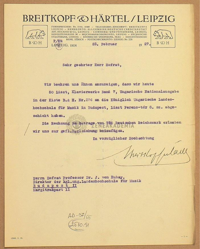 A Breitkopf és Härtel cég levele a Zeneakadémia igazgatójának, Dr. Hubay Jenőnek arról, hogy a Liszt-összkiadás 7. kötetét 50 példányban elküldték,a számlát mellékelték.