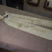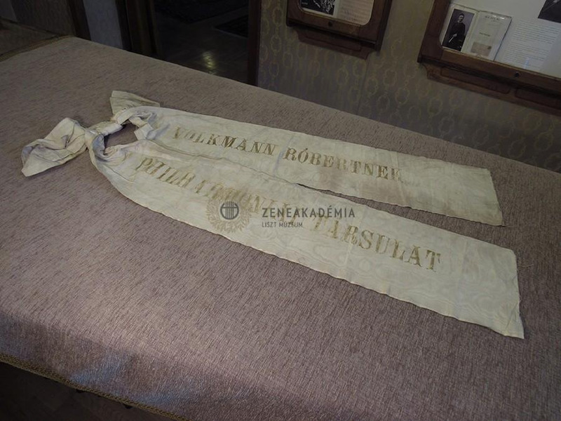 Vajszínű selyem ripsz szalag masnival és arany felirattal: "Volkmann Róbertnek - Philharmóniai Társulat