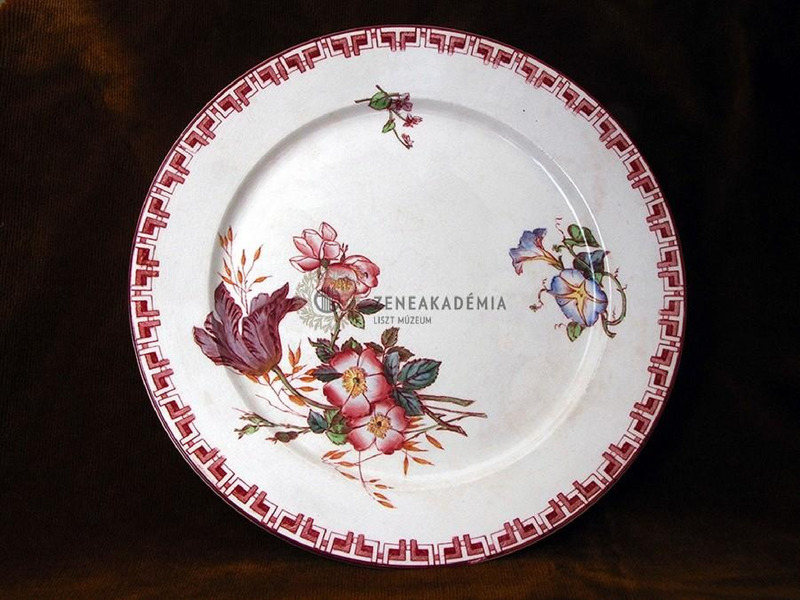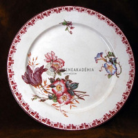 Krémszínű francia porcelán bordó geometrikus szegéllyel és színes virágdíszekkel.