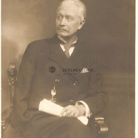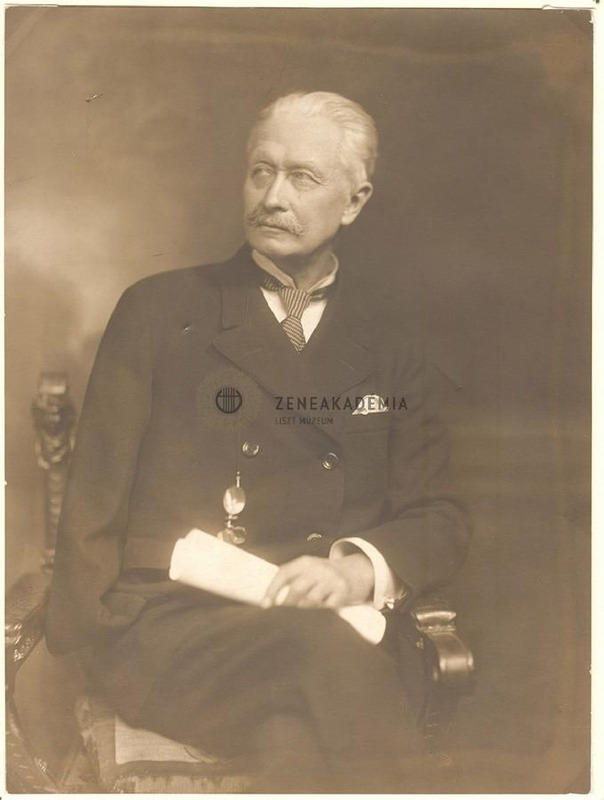 Az idős művész karosszékben ül, sötét öltönyt és csíkos nyakkendőt visel. Baljában papírtekercset tart, gomblyukában szemüveg. A passepartout-n cégjelzés: "Strelisky Photo V., Dorottya u.1."