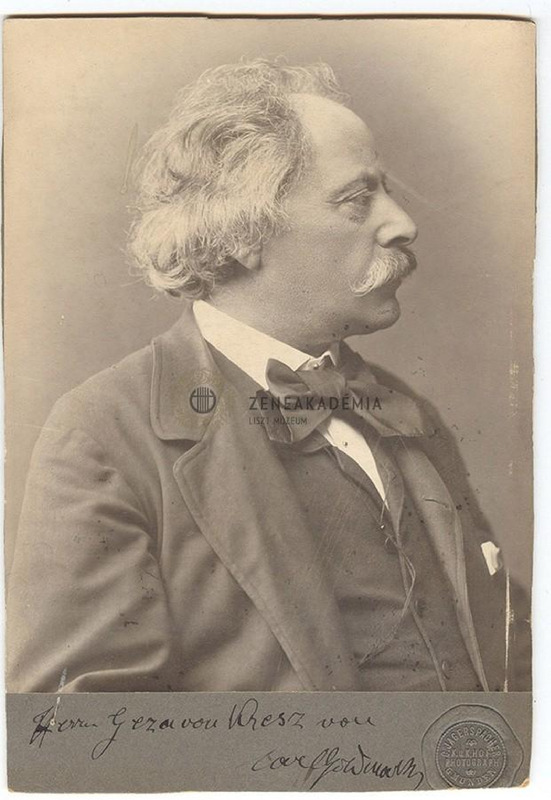Az idősödő Goldmark jobb profilban. A jobb alsó sarokban a fényképész pecsétes cégjelzése: "C. Jagerspacher, K.u.K. Hof Photograph, Gmunden." A fénykép alatt autográf ajánlás:"Herrn Géza von Kresz von Carl Goldmark"