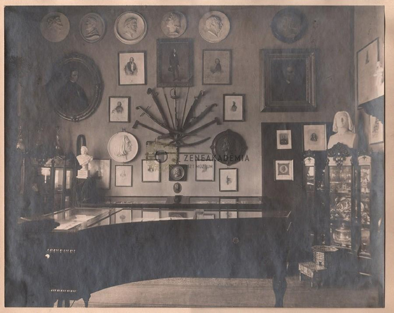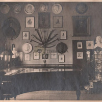 Az előtérben zongora, a kép mindkét sarkában vitrin. A falon képek, plakettek, kardok. A két hátlapján pecsétes cégjelzés: "Phot. Held, Weimar. Nachbildungen nicht gestattet." Utólagos szerző által hitelesített nagyítás.