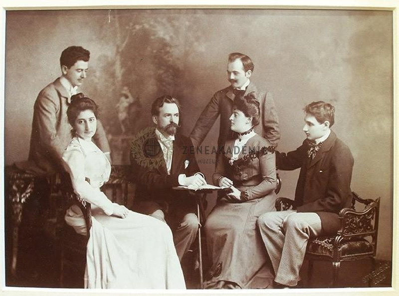 - Hubay kis asztalkánál ül, egyik kezét rajta nyugtatja, másik kezében sétabot. Két fiú növendék mögötte áll, két lány és egy fiú ül. A jobb sarokban mély-nyomásos cégjelzés: "STRELISKY 1900." Hátán is cégjelzés és kézírásos szöveg: " Az 1899-1900-iki tanév IV. osztályának növendékei szeretett Tanáruknak örök hálájuk jeléül. Budapest 1900., június 21-én. Szigeti Dezső. Pillik Imre. Mambriny Gyula. Erna Schulz. Opris Valeria."