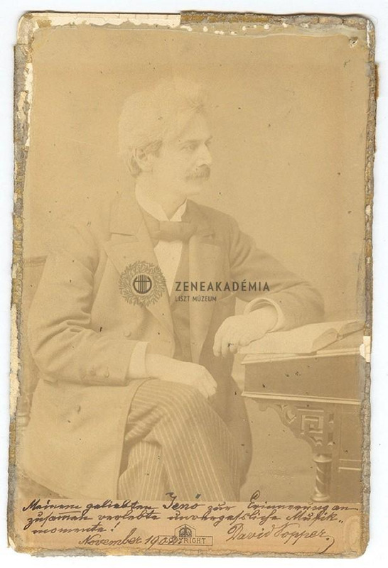 A művész asztal mellett ül, bal kezével nyitott könyvre támaszkodik, jobbra néz. A kép hátán cégjelzés: "Alexander Bassano. Studio - 25 Old Bond St. W. Opposite Burlington Gardens." Alul tintával írott dedikáció: "Meinem geliebten Jenő zur Erinnerung an zusammen verlebte unvergessliche Musikmomente! David Popper. November 1902."