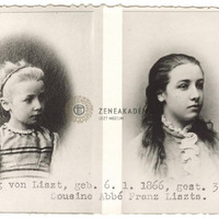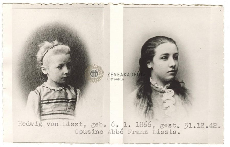 Hedwig von Liszt, Dr. Eduard Ritter von Liszt lánya. Két fotó (egy gyermekkori és egy fiatalkori) fél profilból fényképezett kép egy képeslapon. Alul gépelt aláirás: "Hedwig von Liszt, geb. 6. 1. 1866. gest. 31. 12. 42. Cousine Abbé Franz Liszts"