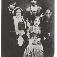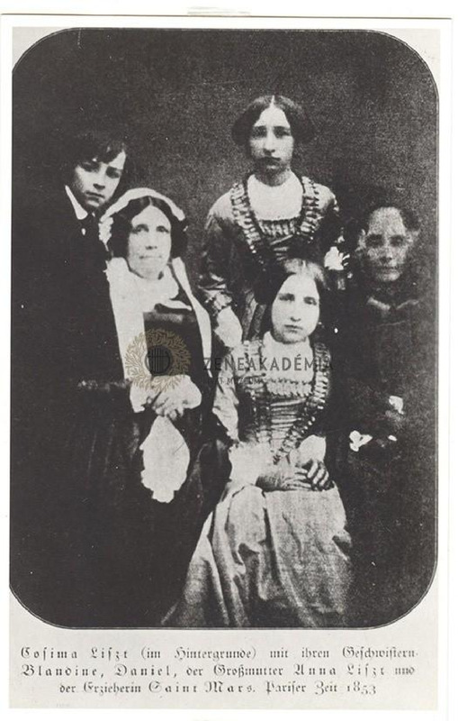 Cosima, Blandine, Daniel, Anna Liszt és a nevelőnő, Madame Saint-Mars. Gót betűs nyomtatott írással: "Cosima Liszt (im Hintergrunde) mit ihren Geschwistern Blandine, Daniel, der Grossmutter Anna Liszt und der Erzieherin Saint-Mars. Pariser Zeit 1853"