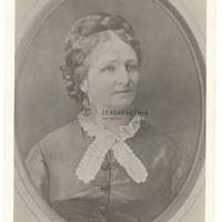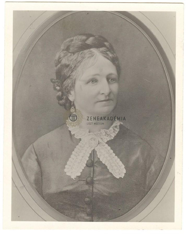 Henriette von Liszt kissé jobbra fordul. Nyakán fehér csipkegallér, haja szépen fonott kontyban. Ovális keretben.
