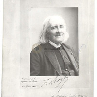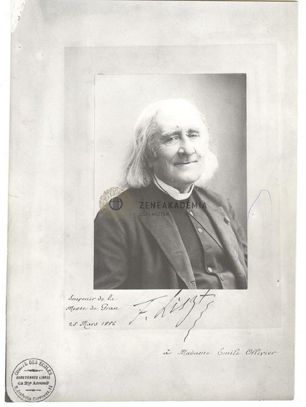 Liszt kissé jobbra fordul, mosolyog, ajka beesett. A kép bal alsó sarkában és lejjebb idegen kalligráfiával: "Souvenir de la / Messe de Gran /25 Mars 1886". és "a Madame Emile Ollivier". A kép alatt középen Liszt sk. aláírása. A passe-partout bal alsó sarkában bélyegző : " Comité des Écoles Chrétiennes Libres du 2me Arrond[issemen]t" A kép hátára ragasztva Liszt 1886. márc. 25-i párizsi koncertjének plakátja.
