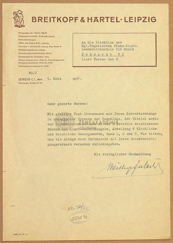 A Breitkopf és Härtel cég levele a Zeneakadémia igazgatóságának arról, hogy a Liszt-összkiadás 5.,6. és 7. kötetének korrektúra-kivonatát elküldték.