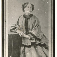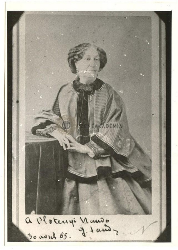 Az idősödő George Sand jobb kezével asztalra támaszkodik. Alul ajánlás sajátkezű aláírással: "A Plotenyi Nando [sic] /G.Sand/30 aout 65."