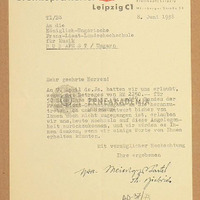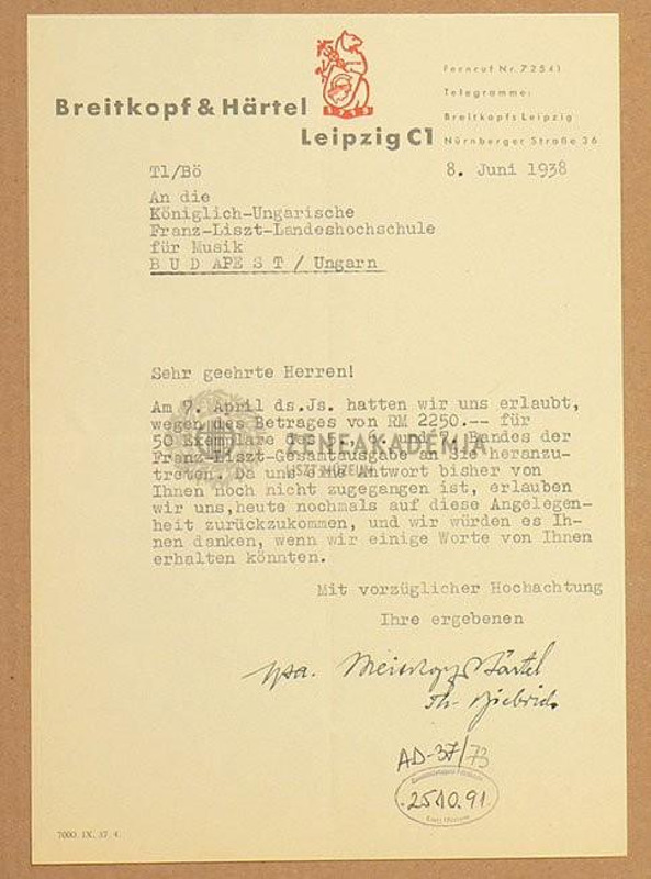 A Breitkopf és Härtel cég levele a Zeneakadémiának arról, hogy a Liszt-összkiadás 5.,6. és 7. kötetéről 1938.04.07-én elküldött számláról szóló értesítésükre még nem kaptak választ, s ezt mihamarabb pótolják.