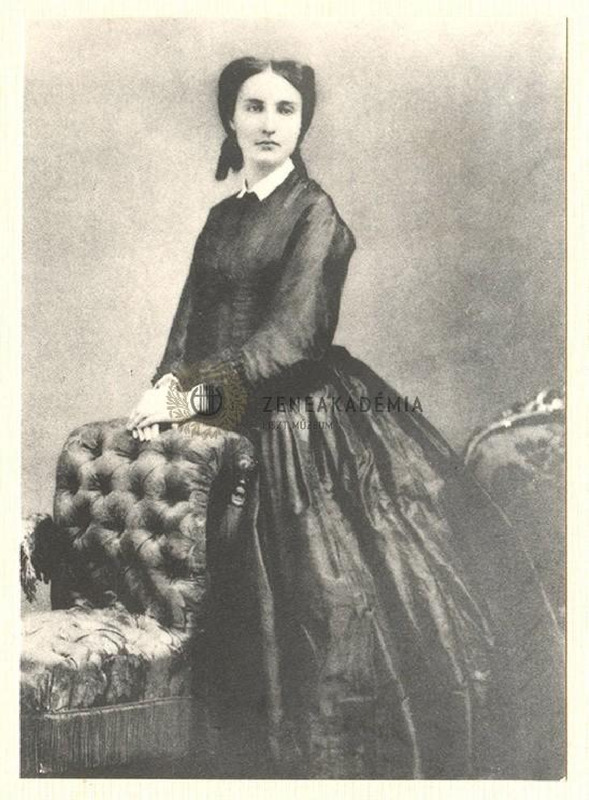 A hercegnő hosszú fekete ruhában egy kárpitozott szék mögött áll, kezeit a széken nyugtatja.
