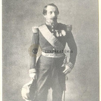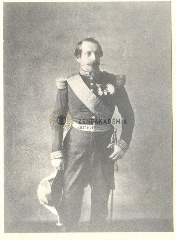 III. Napóleon díszegyenruhában áll, bal kezével kardjának markolatát fogja, jobb kezében kalapját tartja.