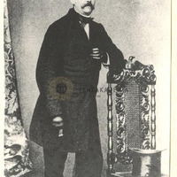 Bismarck herceg kissé jobbra fordulva áll, jobbjával faragott székre támaszkodik.