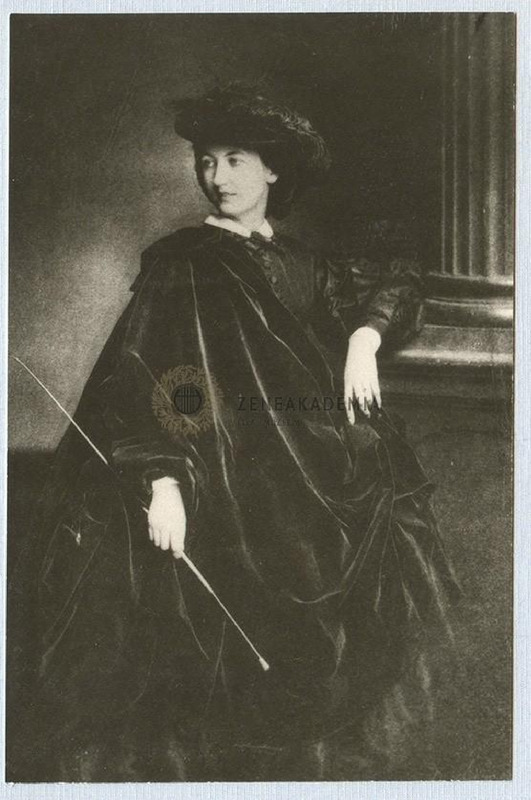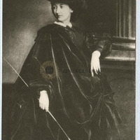 A bő utiköpenyt viselő táncosnő bal karjával oszlop talapzatára támaszkodik, jobbjában hosszú pálcát tart.