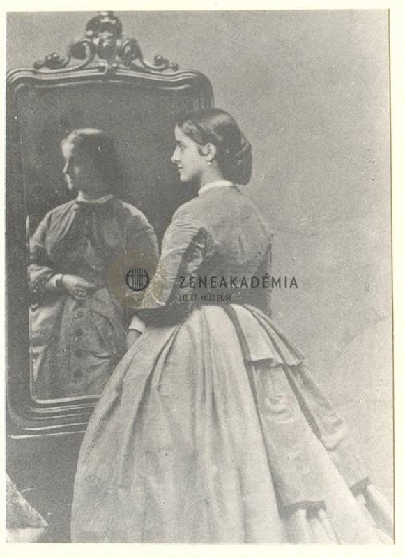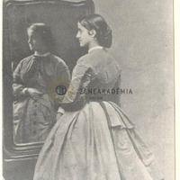 Az énekesnő bal profilban, tükör felé fordulva áll, jobb profilja a tükörben látszik.