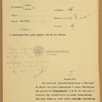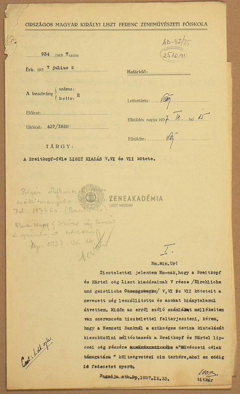 A Zeneakadémia beadványa a vallás-és közoktatási minisztériumnak, mely a Liszt-összkiadás 5.,6. és 7. kötetének 2250 márkás számlájának kiegyenlítését sürgeti a Breitkopf és Härtel cégnek.