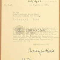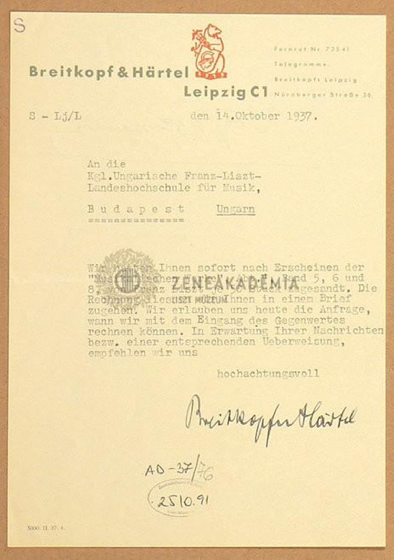 A Breitkopf és Härtel cég levele a Zeneakadémiának arról, hogy a Liszt-összkiadás V. részének 5., 6. és 8. kötetét 50-50 példányban elküdték, a számlát levélben mellékelték.