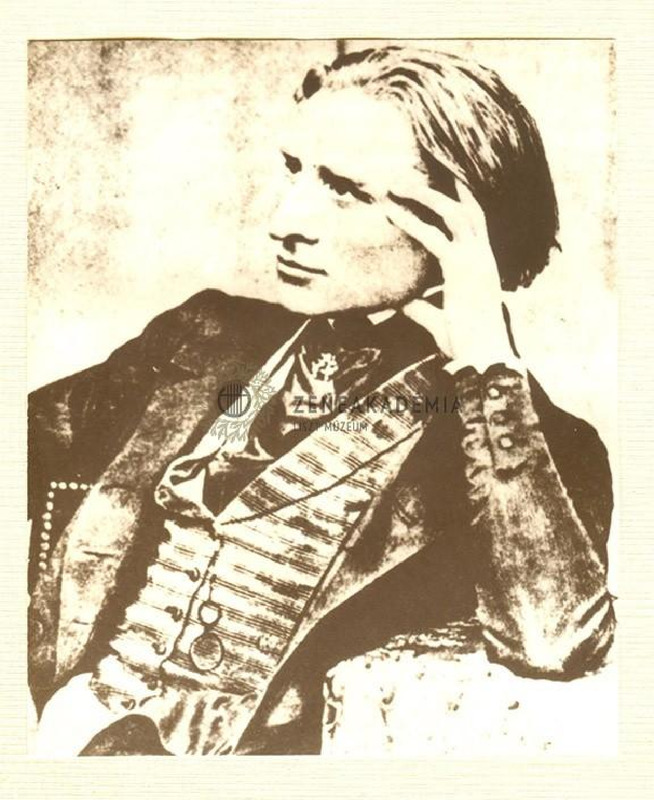 Az ifjú Liszt zakót és csíkos mellényt visel, bal kezével halántékát támasztja. 1843-ban készült daguerrotípia reprodukciója.