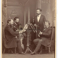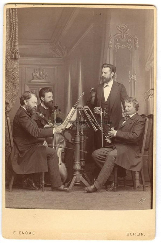 Joachim-Quartett. Stukkómintás szobában, hangszereikkel kezükben,, hárman ülnek, egy személy áll. Szignálva a kép alján és hátán is. A kép bal sarkába belenyomva 884. Feljegyzés kézzel a kép hátán: Joachim kvartett. (A vonósnégyes tagjai a korabeli dokumentumok alapján: Joachim József - violino l., Robert Hausmann - Violoncello, Carl Halir - violino2., Emanuel Wirth - Viola. Azonosítandó.) Eredeti fotó, magnéziumos pillanatfelvétellel.
