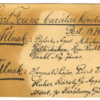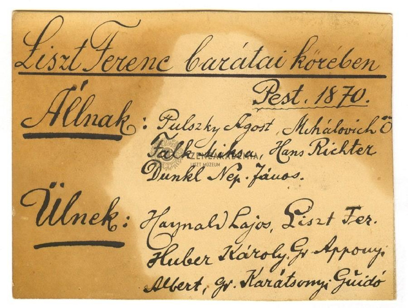 Liszt Ferenc abbé ruhában a zongoránál ül, körülötte ülnek: Haynald Lajos, Széchényi Imre, Apponyi Albert, Karátsonyi Guidó. Állnak: Huszár Imre, Mihalovich Ödön, Augusz Antal, Richter János, Dunkl Nepomuk János. Az üveglemezhez tartozó papíron téves felirat: "Liszt Ferenc barátai körében 1870." Az ugyanitt olvasható lista a fényképen szereplők nevével részben ugyancsak téves.