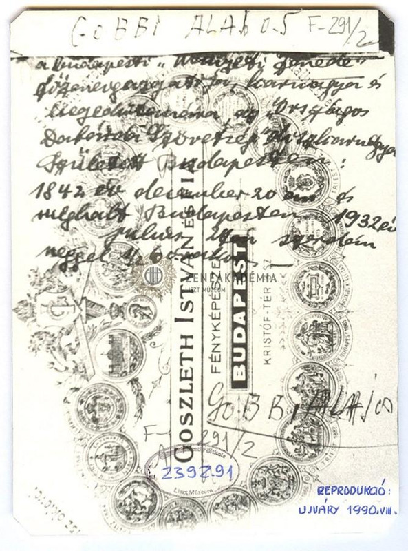 A művész bal profilból látható. Sötét zakót és nyakkendőt visel. A fénykép hátán cégjelzés és kéziratos felirat: "Gobbi Alajos a budapesti nemzeti zenede főzeneigazgatója, karnagya és hegedűtanára, az Országos Dalárda Szövetség díszkarnagya. Született Budapesten 1844. év december 20-án és meghalt Budapesten 1932. év július 21-én szerdán reggel 1/2 6 órakor."