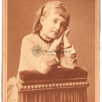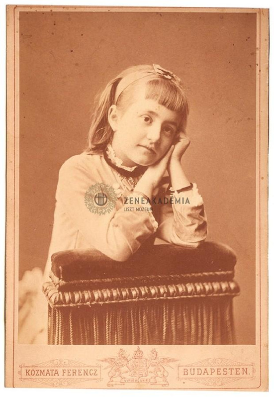 A kislány bársonnyal kárpitozott térdeplőn könyököl, arcát kezeibe támasztja. A fénykép alján cégjelzés: "Kozmata Ferenc, Budapesten."