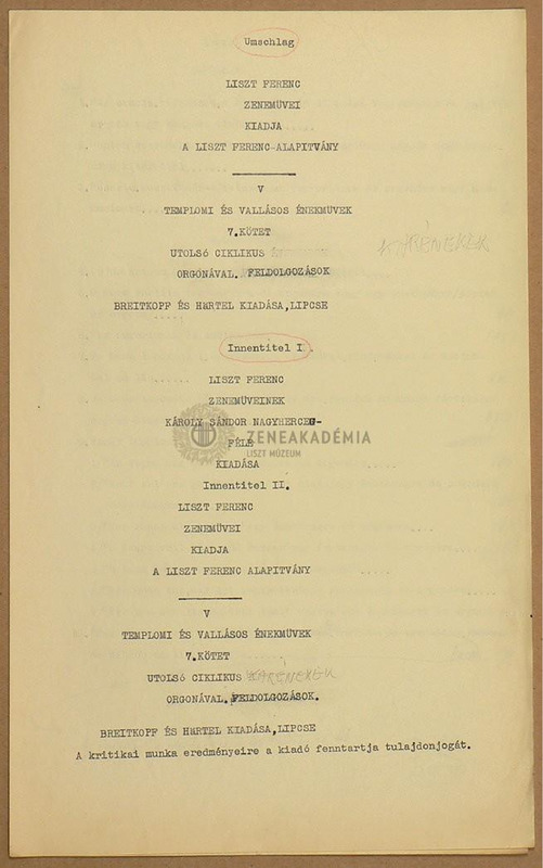 - A Liszt-összkiadással kapcsolatos számlák és átvételi elismervények, értesítő levelezések a Breitkopf és Härtel céggel.