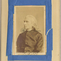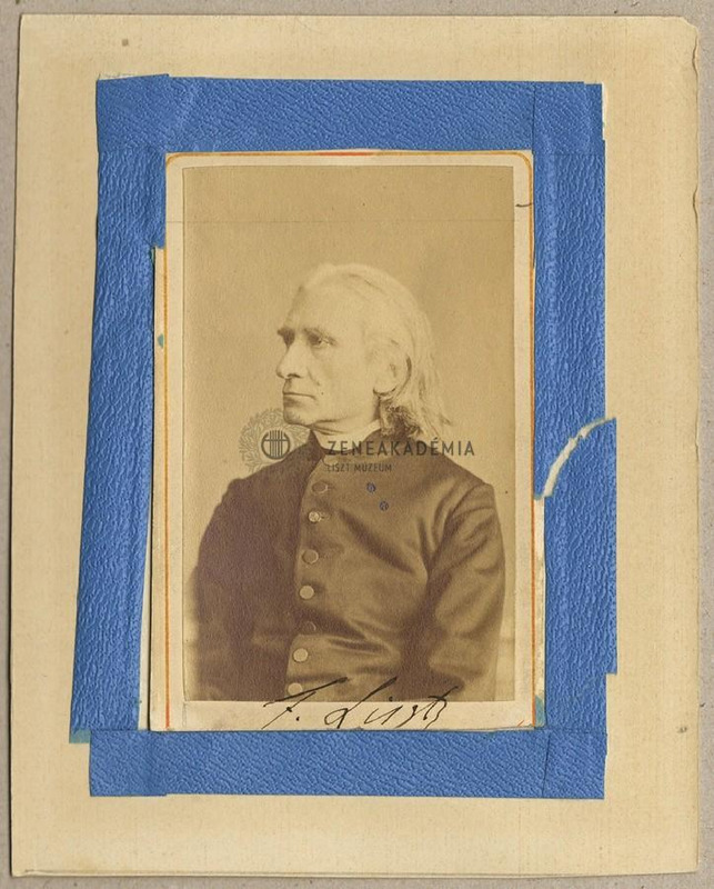 A reverendát viselő idősödő Liszt bal félprofilban látható, haja a füle mögé fésülve. A fénykép alján Liszt sajátkezű fekete tintás aláírása: "F. Liszt"