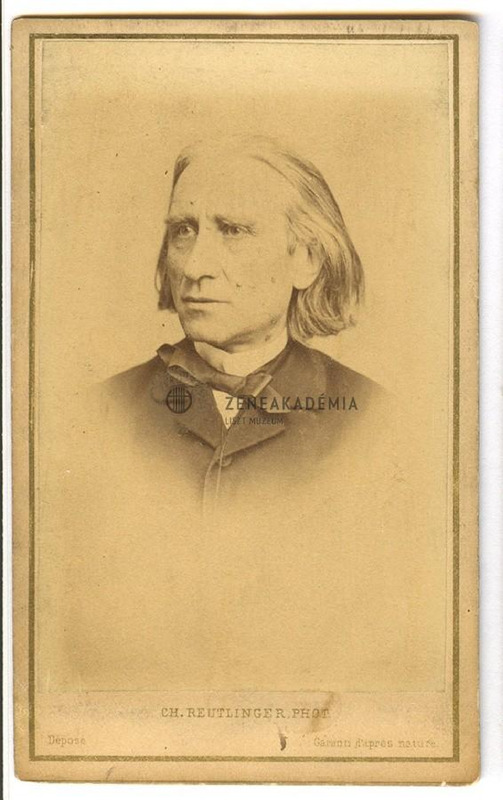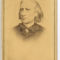 Liszt Ferenc bal félprofilban látható. Kabátot és állógallért visel, csokornyakkendője félre áll.