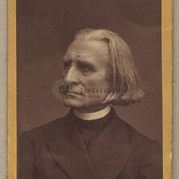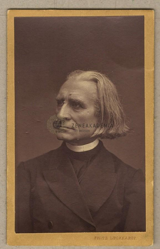 Liszt Ferenc bal félprofilban látható, kabátot és papi gallért visel, felfele tekint. A fénykép alatt cégjelzés: "Fritz Luckhardt". Az alaplap hátoldalán további cégjelzés.