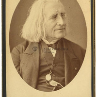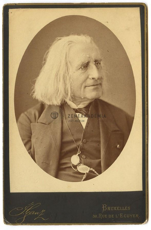 Az idős Liszt ovális alakú fotója téglalap alakú hátlapon. A művész kabátban, szemüvege láncon függ.A passepartout-n cégjelzés: "J. Ganz Bruxelles 38, Rue de lEcuyer" A fekete hátoldalra utólag ráragasztott fehér lapon sajátkezű ajánlás: "Louis Rothfeld ungarisch ergeben, F.Liszt. October 83, Weimar."