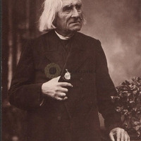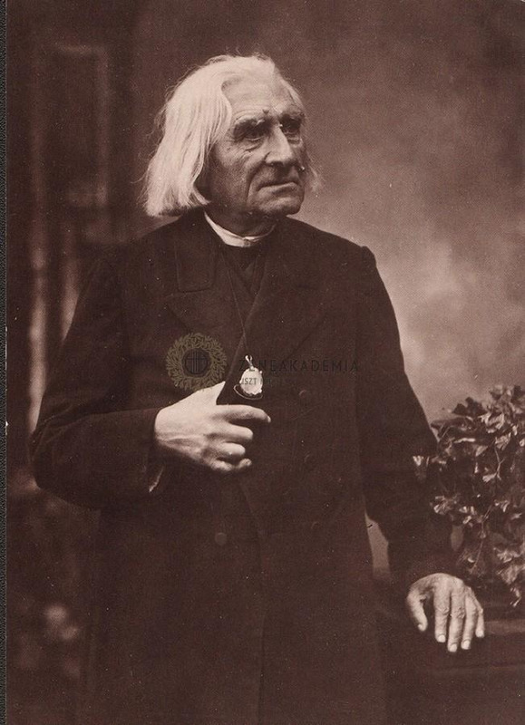 Az idős Liszt kabátot és papi gallért visel, zsebórája mellén függ, bal kezével asztalra támaszkodik, amelyen leveles növény áll.