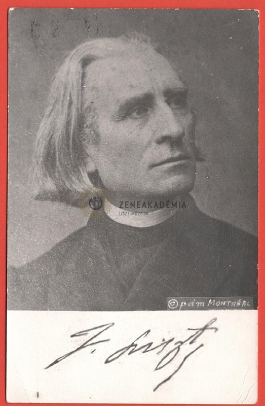 A középkorú Liszt kabátot és abbégallért visel, felfele tekint. A fénykép alatt hasonmás aláírás.