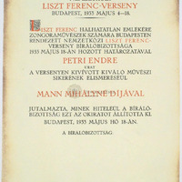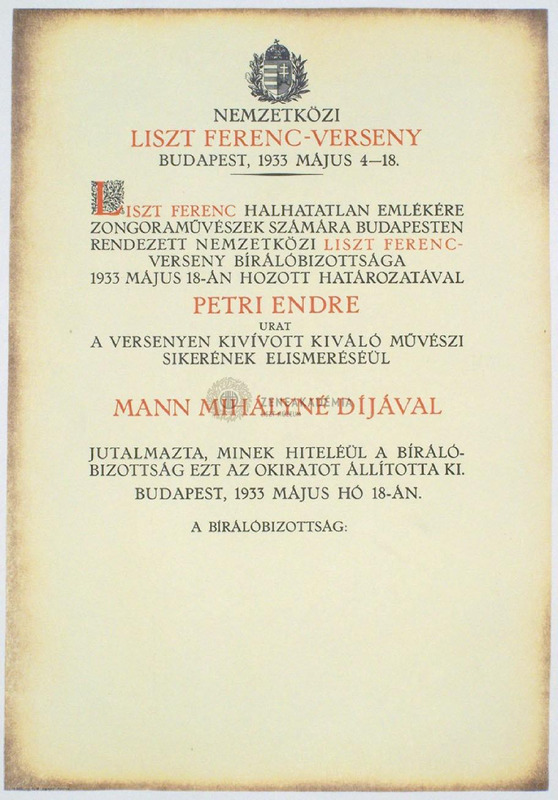 Díszoklevél a Mann Mihályné-díjjal jutalmazott Petri Endre részére az 1933-as Nemzetközi Liszt Zongoraversenyről.