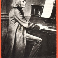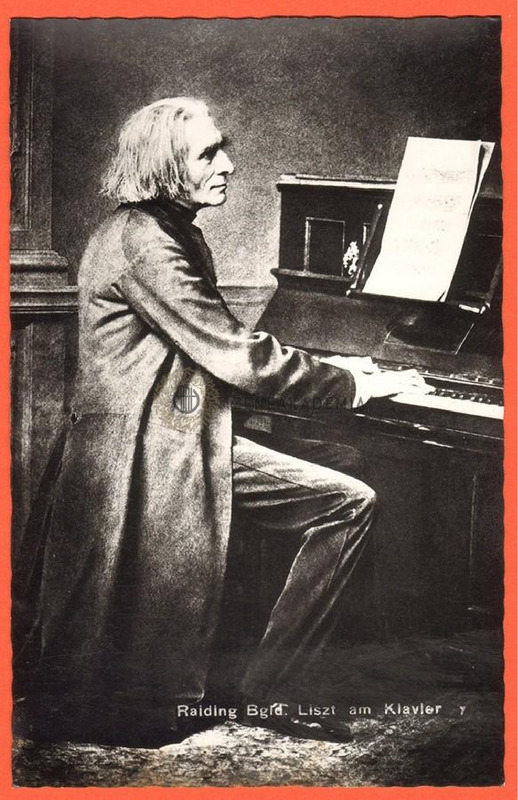 A középkorú Liszt hosszú kabátban pianínón játszik, előtte kottalap. Franz Hanfstaengl eredeti képének modern sokszorosítása. A fénykép alján nyomtatott felirat: "Raiding Bgld. Liszt am Klavier".