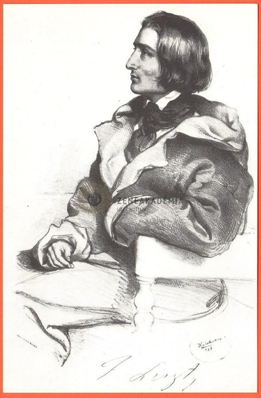 A fiatal Liszt utazókabátot visel, nyakán sötét színű, csomóra kötött kendő. Karosszéken ül. A kép alján Liszt aláírása.