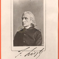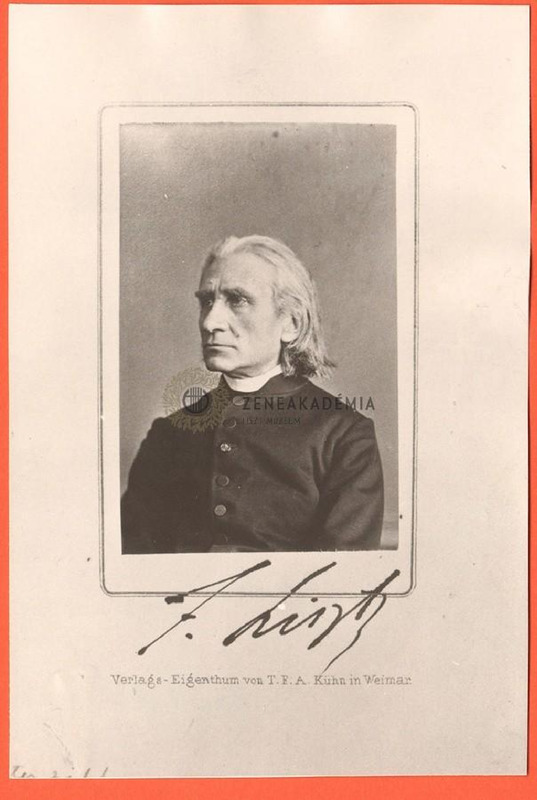 Liszt aláírásával. Az abbéruhás Liszt balra fordul, haja füle mögé fésülve. Az eredeti kép passepartout-ján gépírással: Verlags-Eigenthum von T.F.A. Kühn in Weimar