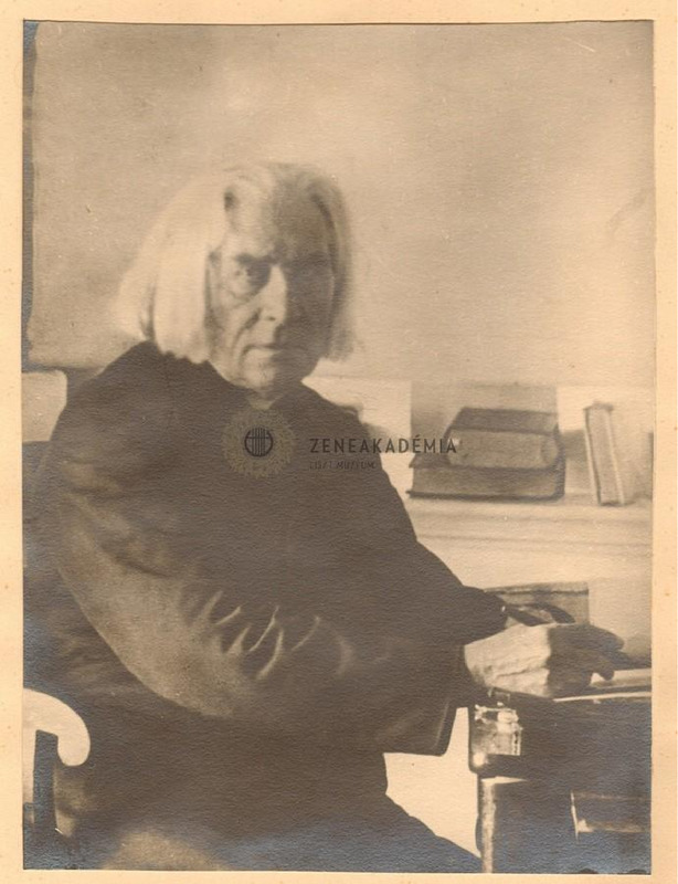 Az idős Liszt Ferenc derékképe. Liszt abbéruhában az asztalnál ír, a háttérben két könyv látszik.