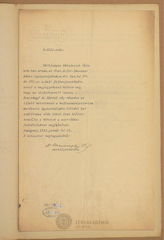 A vallás-és közoktatási minisztérium értesítése Mihalovich Ödönnek, a Zeneakadémia igazgatójának arról, hogy a 2. részlet-4500 korona-kifizetése csak akkor esedékes, ha a Breitkopf és Härtel cég által szállított kötetek a szerződés feltételeinek megfelelnek.
