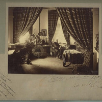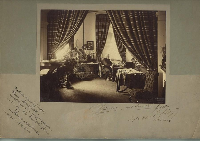 Liszt Ferenc a Hofgärtnerei-i dolgozószobájában. A kemény kartonhátlap rectóján a fénykép alatt jobbra Liszt autográf dedikációja Thomán Istvánnak: "Mit avec, und sans ohne fehlenF. Liszt. Sept: 85 - Weimar." A fénykép jobb sarka alatt átlósan Thomán István autográf dedikációja Kern Aurélnak: "Kedves barátjának / Kern Aurélnak, / emlékezésül a nagy mesterre / és ennek kis tanítványára/ Thomán Istvánra / Budapest, 1914. III. 20."