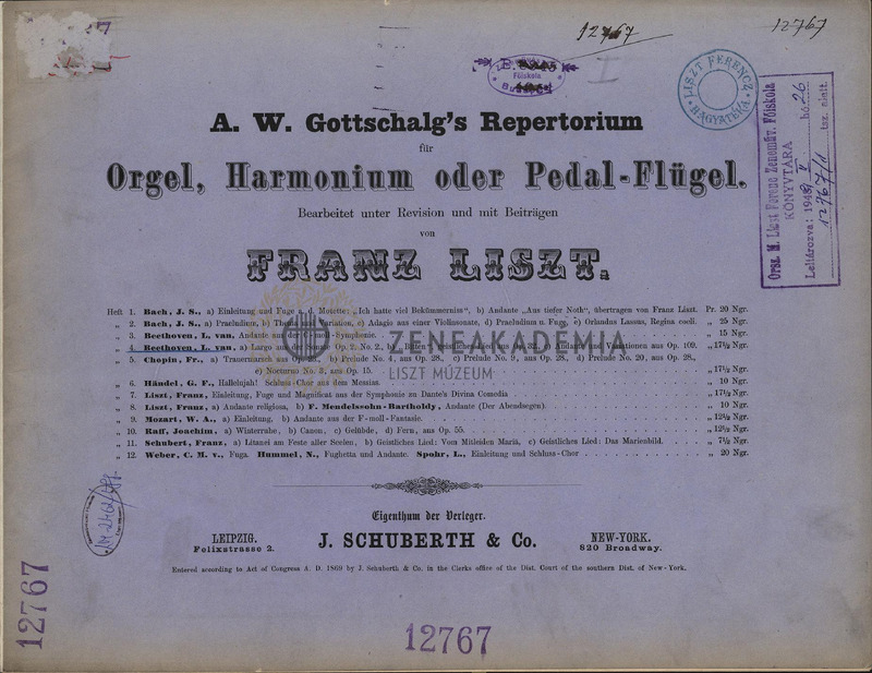 Gottschalgs Repertorium für Orgel, Harmonium oder Pedal-Flügel. Bearbeitet unter Revision und mit Beitragen. (I. Serie,) Heft 4. Beethoven, (Ludwig van): a/ Largo aus der Sonate Op. 2. No. 2. b/ "Bitten", geistliches Lied aus Op. 32. c/ Andante und Variationen aus Op. 109.