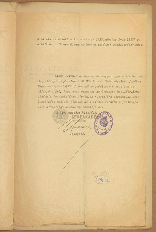 A vallás-és közokatatási minisztérium IX. kerületi állampénztárhoz intézett rendeletének másolata arról, hogy a Liszt-összkiadás 50 példányának 3. részlete, 4500 korona a Breitkopf és Härtel cégnek kifizettessék.
