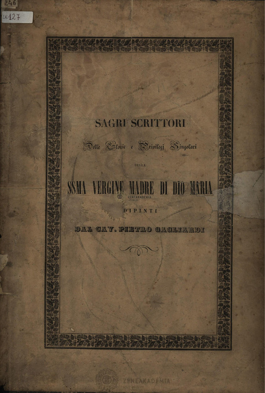 Címvariáns a kötéstáblán: Sagriscrittori delle glorie e prvilegj singolari della Ssma Vergine Madre di Dio Maria dipinti dal Cav. Pietro Gagliardi. Nyomtatott ajánlással Gustav Hohenlohe-Schillingsfürst érseknek. Olvashatatlan nevű személy Lisztnek szóló kéziratos ajánlásával. Hagyatéki bélyegző és könyvtári jelzet nélkül.