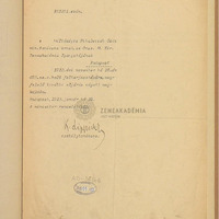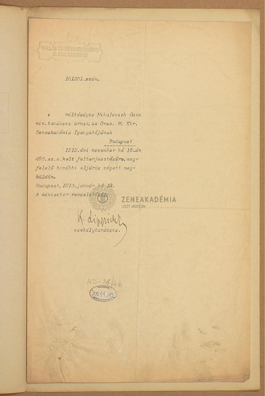 A vallás-és közoktatási minisztérium értesítése Mihalovich Ödönnek, a Zeneakadémia igazgatójának arról, hogy a 4. részlet-4500 korona-kifizetéséről szóló felterjesztését megfelelő további eljárás végett megküldi.