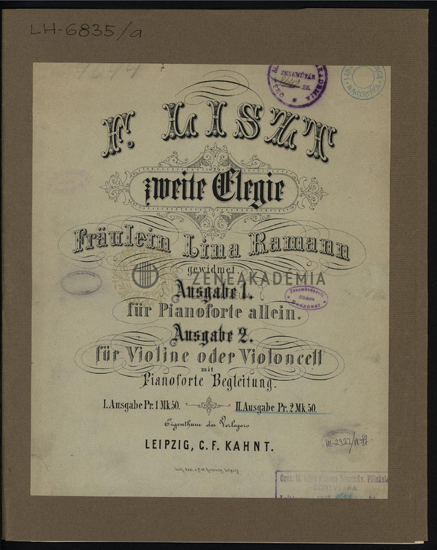 Zweite Elegie Fräulein Lina Ramann gewidmet. Ausgabe 2. für Violine oder Violoncell mit Pianoforte Begleitung. (R. 472, S. 131. Partitur und Stimmen).