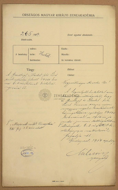 Mihalovich Ödön, a Zeneakadémia igazgatójának beadványa a vallás-és közoktatási miniszternek.A Liszt-összkiadás költségének (54000 korona) 6. részletének kifizetését kéri.Mihalovich aláírásával.