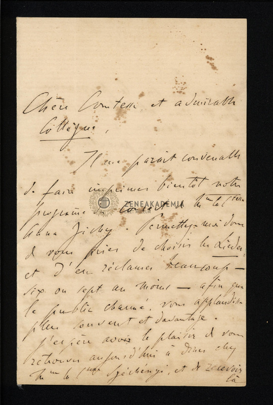 Liszt kéri, hogy válasszon legalább 6-7 dalt a Zichy Anna grófné által szervezett hangversenyre, és kéri, hogy Széchényi gróf dalaiból is vegyen be egyet.