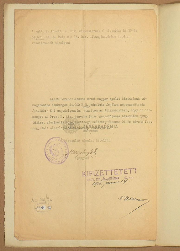 A vallás-és közokatatási minisztérium IX. kerületi állampénztárhoz intézett rendeletének másolata arról, hogy a Liszt-összkiadás 50 példányának 8. részlete, 4500 korona a Breitkopf és Härtel cégnek kifizettessék.