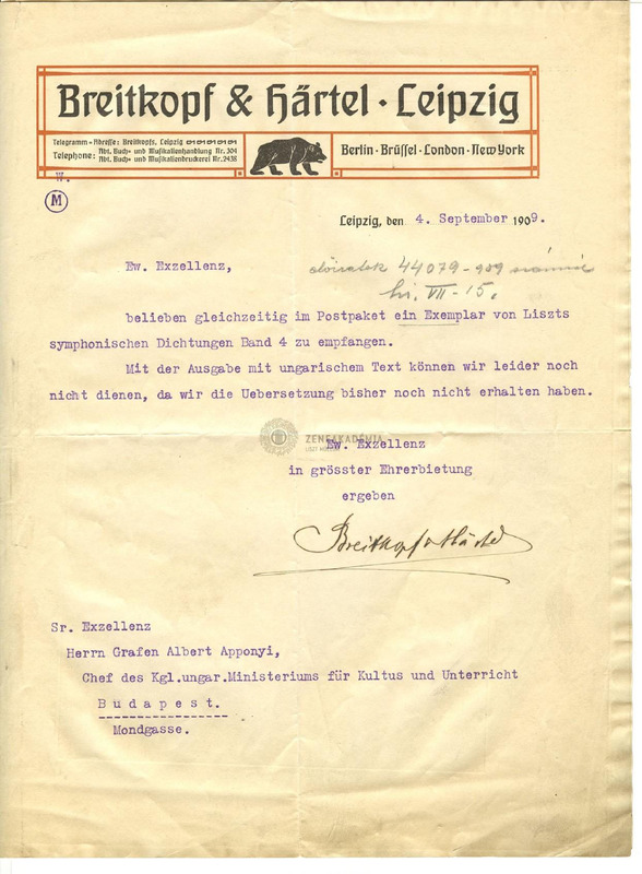 A Breitkopf és Härtel cég levele Apponyi Albert grófnak,a magyar oktatási miniszternek arról, hogy a Liszt-összkiadás 4. kötetét (Szimfonikus költemények) postára adták és a magyar fordítás még nem készült el.